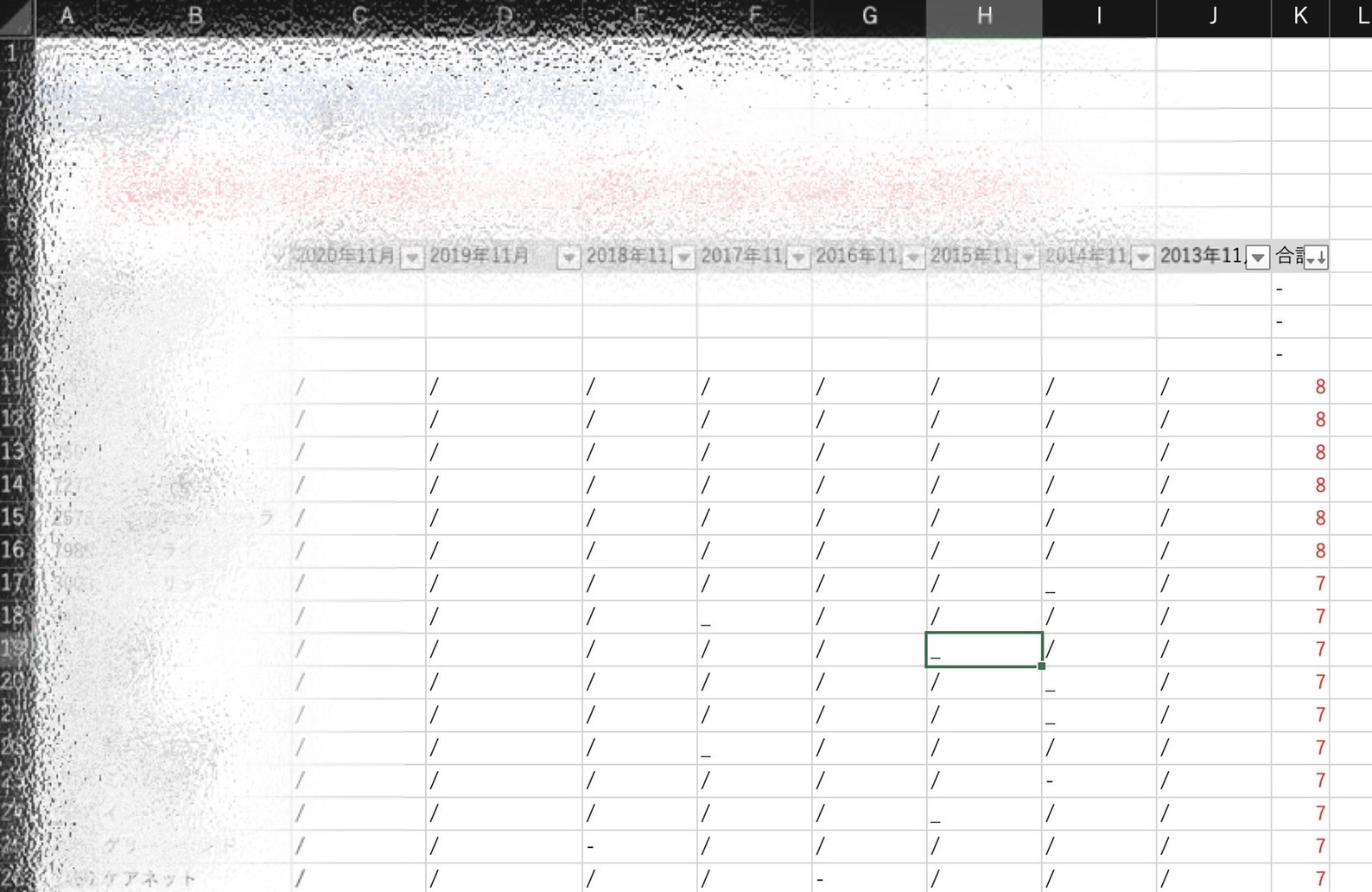内容はgoogle spreadsheetで、下記画像のように過去8年間の勝ち負けを私自らが手動で調べたものになります。