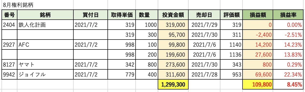 イベント株投資6ヶ月目です。8月に権利月を迎える銘柄を7月の頭に購入する月です。いい結果が出ました。